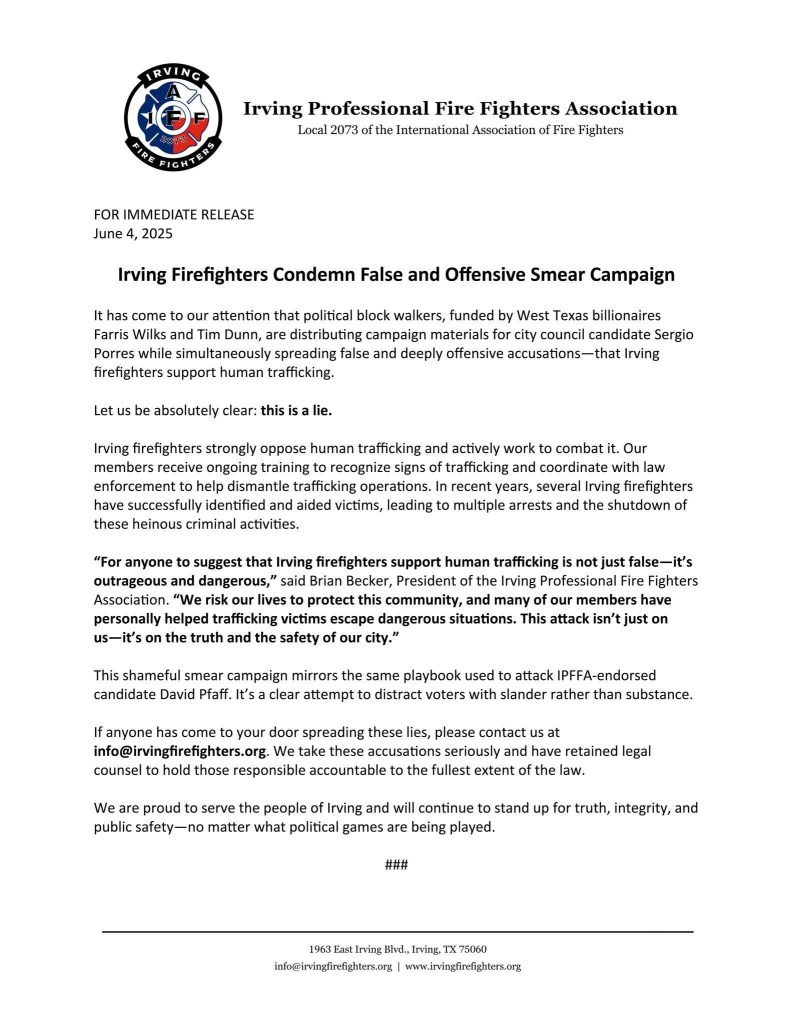 The two Texas billionaires who created the Defend Texas Liberty PAC, Farris Wilks and Tim Dunn, are distributing false information about the Irving Fire Fighter Association claiming they are involved in human trafficking. This is what can happen when you have unlimited money to spend and spread lies with paid block walkers. The Association has issued a press release below. They are not happy and are threatening legal action.