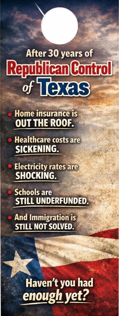 Our district has elected a Republican for State Representative for almost 30 years yet our home insurance is out the roof. The cost of health insurance is sickening. Electricity rates are shocking. Schools continue to be under funded. Home prices are out of reach for many. Our immigration system is still broken. If elected, Bowen will simply take a knee to Greg Abbott and follow his every command. Nothing will change until we change our voting patterns.