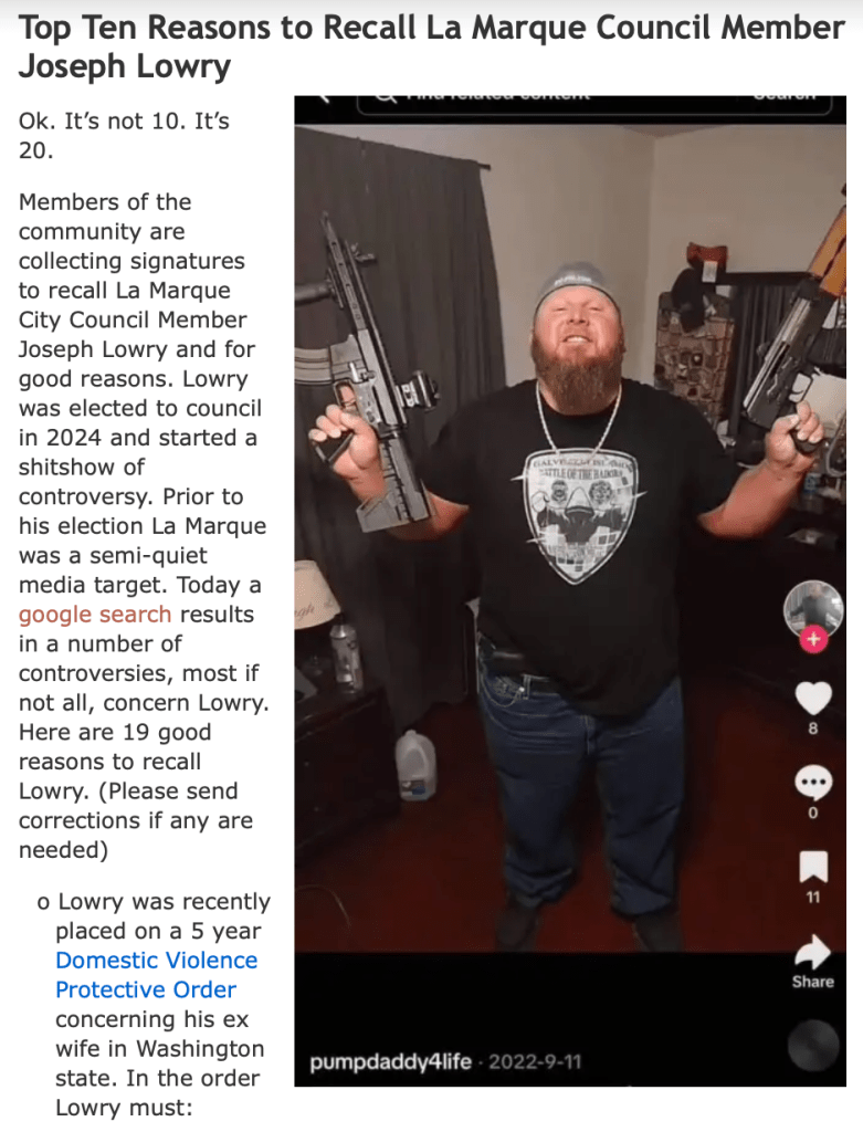 Mr. Loftis made it clear to Galveston County law enforcement that something had to be done about Lowry and his harassment of individuals. This is the second time they have been warned, first by Council Member Yancy during a press conference where, as expected, Lowry caused a disruption. Lowry has had numerous complaints filed against him with the police for harassment and yet no action has been taken. He has a number of lawsuits pending against him for harassment. His Facebook “Lowry News Network” page has been removed a number of times for harassment. He has a history of harassment in Washington resulting in a Domestic Violence Protection Order. The list of his harassment is documented here.
