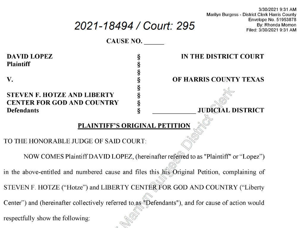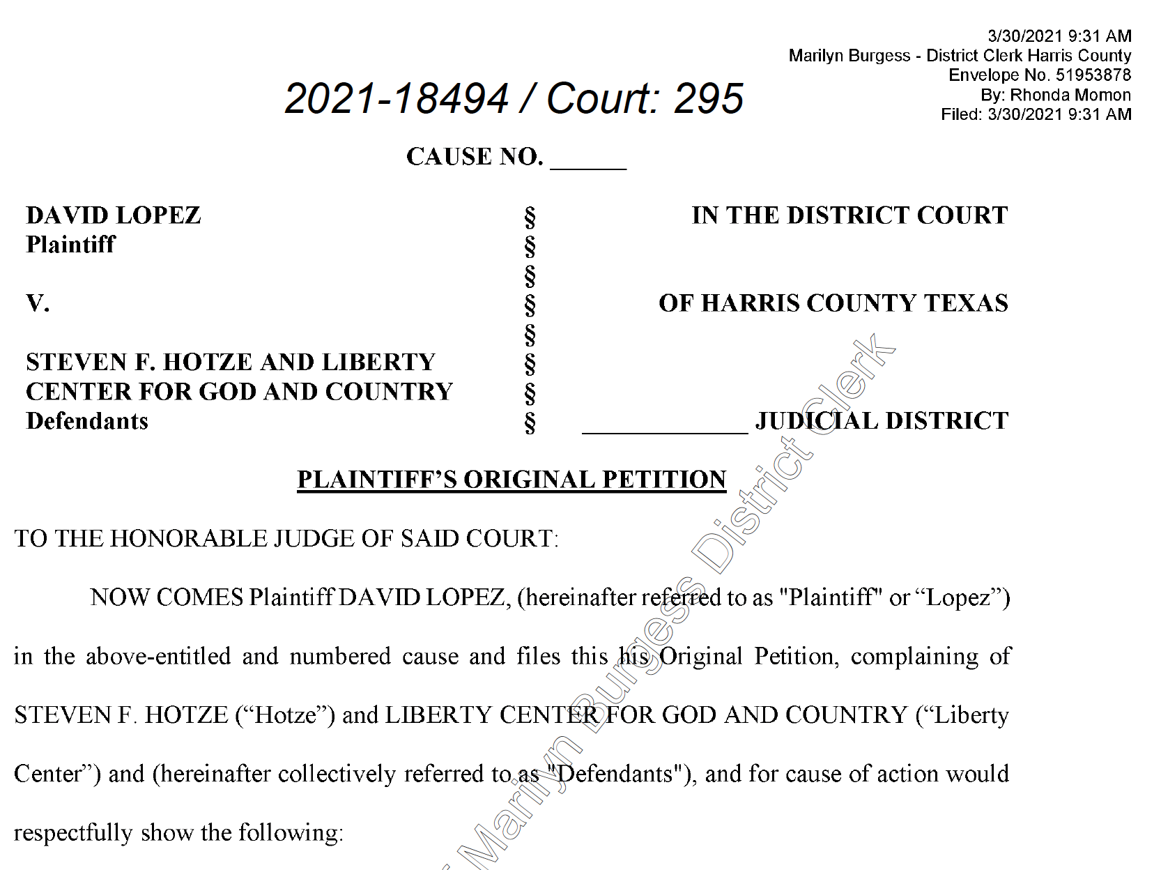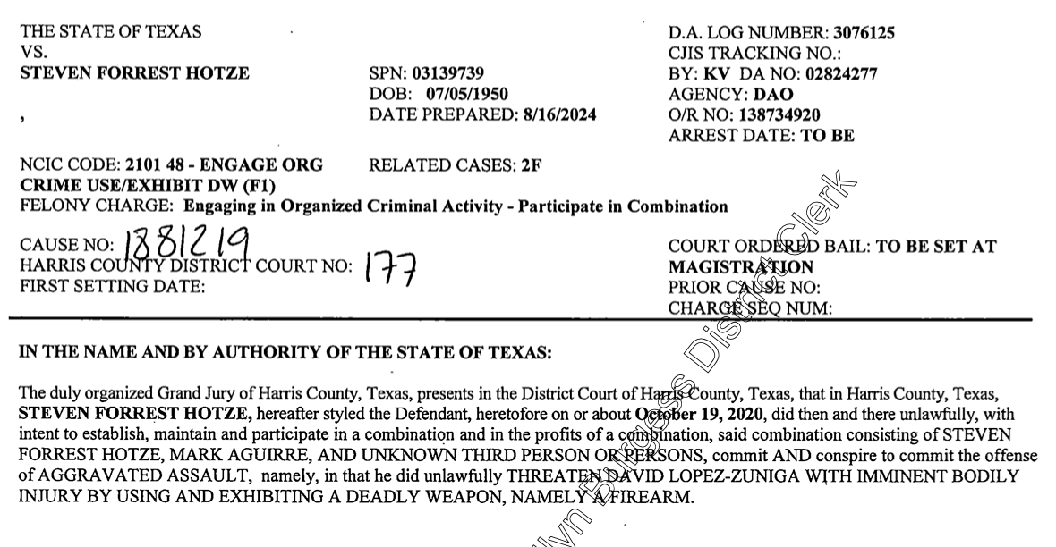Later Hotze was also charged with 4 felonies including engaging in organized crime, Case # 188121801010. The AC repairman has since filed a civil suit against Hotze and Liberty Center for God and County. You can read the entire complaint here. There is a damning recording between Hotze and a US Marshal, Lt Governor Dan Patrick’s brother asking for help for the arrest of the AC repairman.