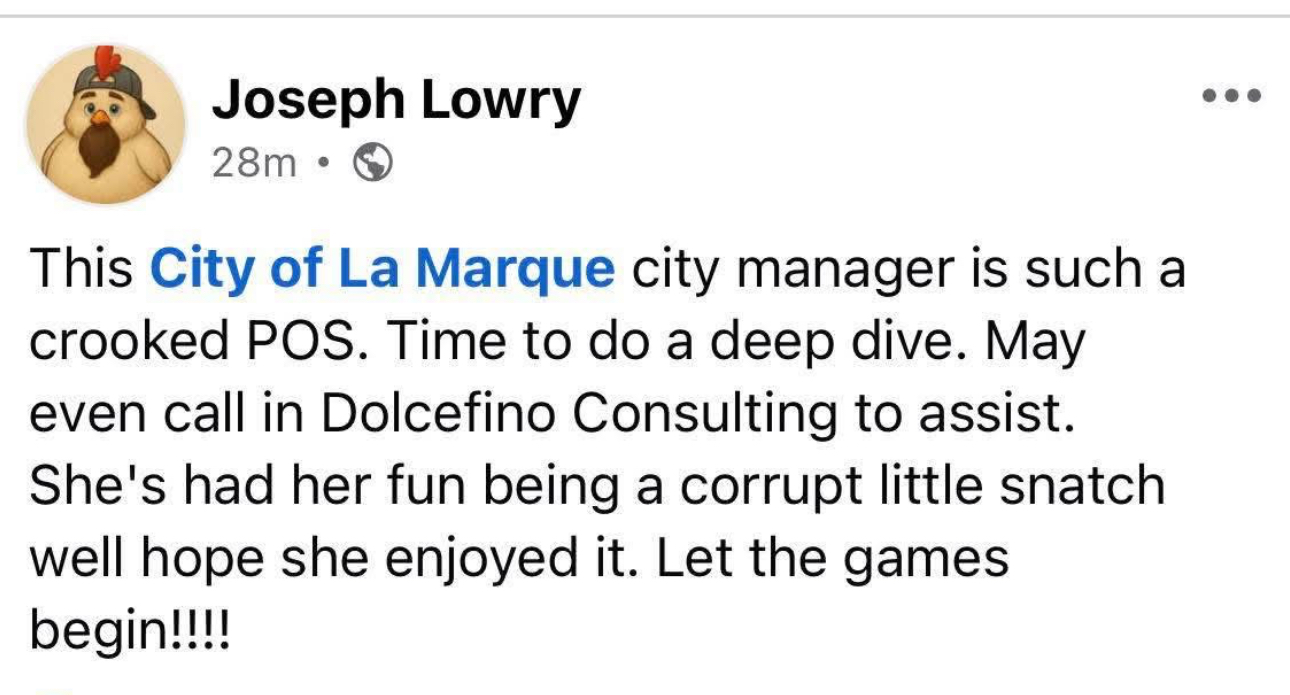 3. Allegation: Lack of Fitness for Duty This allegation is false and without foundation. I have served the City of La Marque continuously for twenty-two (22) years as a Councilmember, Mayor Pro Tem, and Mayor. At no point during this period has my fitness for duty been questioned by voters, medical professionals, courts, or governing authorities. The affiant is not a licensed physician, mental health professional, or qualified evaluator and has no authority or basis to make such a determination. This allegation did not arise until the affiant’s arrival in La Marque politics and is inconsistent with my long record of service. —