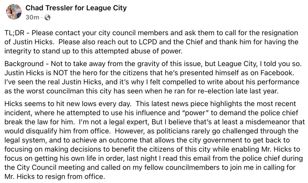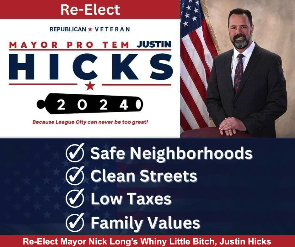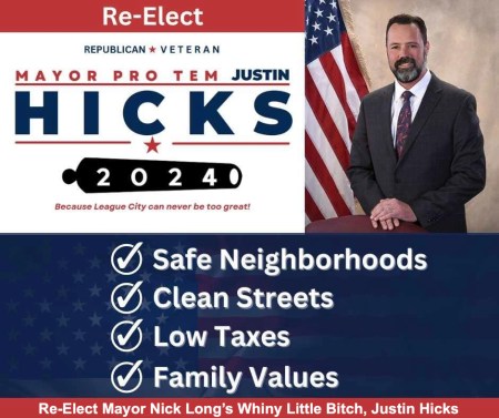 You would think the Mayor of League City would learn to read the room and STFU especially after this buddy Justin Hicks passed the chaos torch to La Marque and resigned. But the peaceful protest in his city against his lord and savior, Donald Trump, triggered him.