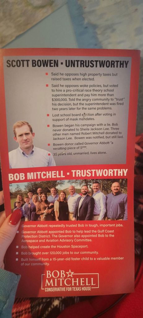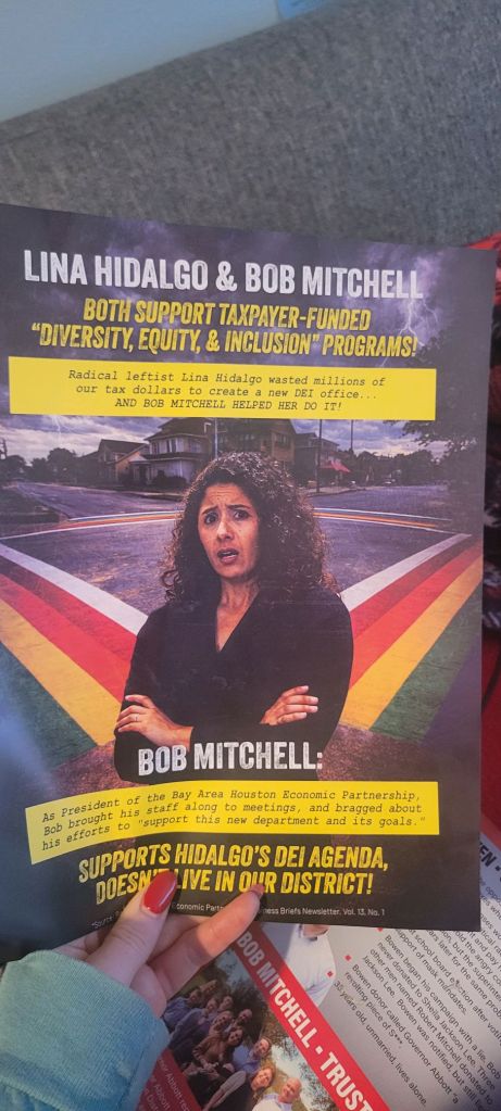 Traci also thinks she will take control in March but it is June, right in the middle of our campaign. Traci is good at being Miss obvious with simple minded comments like “we need to work together” and “We have to reach out to the youth” and “We have to win in 2026” and “We need work together” (Did I say that twice?”). It makes me think AND/OR DUH! Her endorsements are also bothering with only two organizations endorsing her, the Harris County Black American Democrats, and Area 5 which is puzzling. Why? She claims the City Controller, Chris Hollins has endorsed her. I have not seen any proof of that, and if that is actually true it is very disturbing.