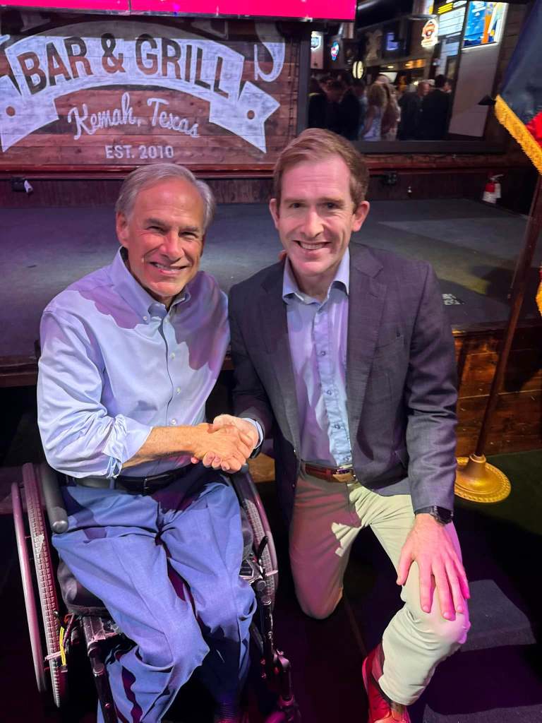 Former CCISD Trustee Scott Bowen, seen here taking a knee to Greg Abbott, and former President of Bay Area Economic Partnership, Bob Mitchell, are raking in outside special interest money for their race to represent the Bay Area.